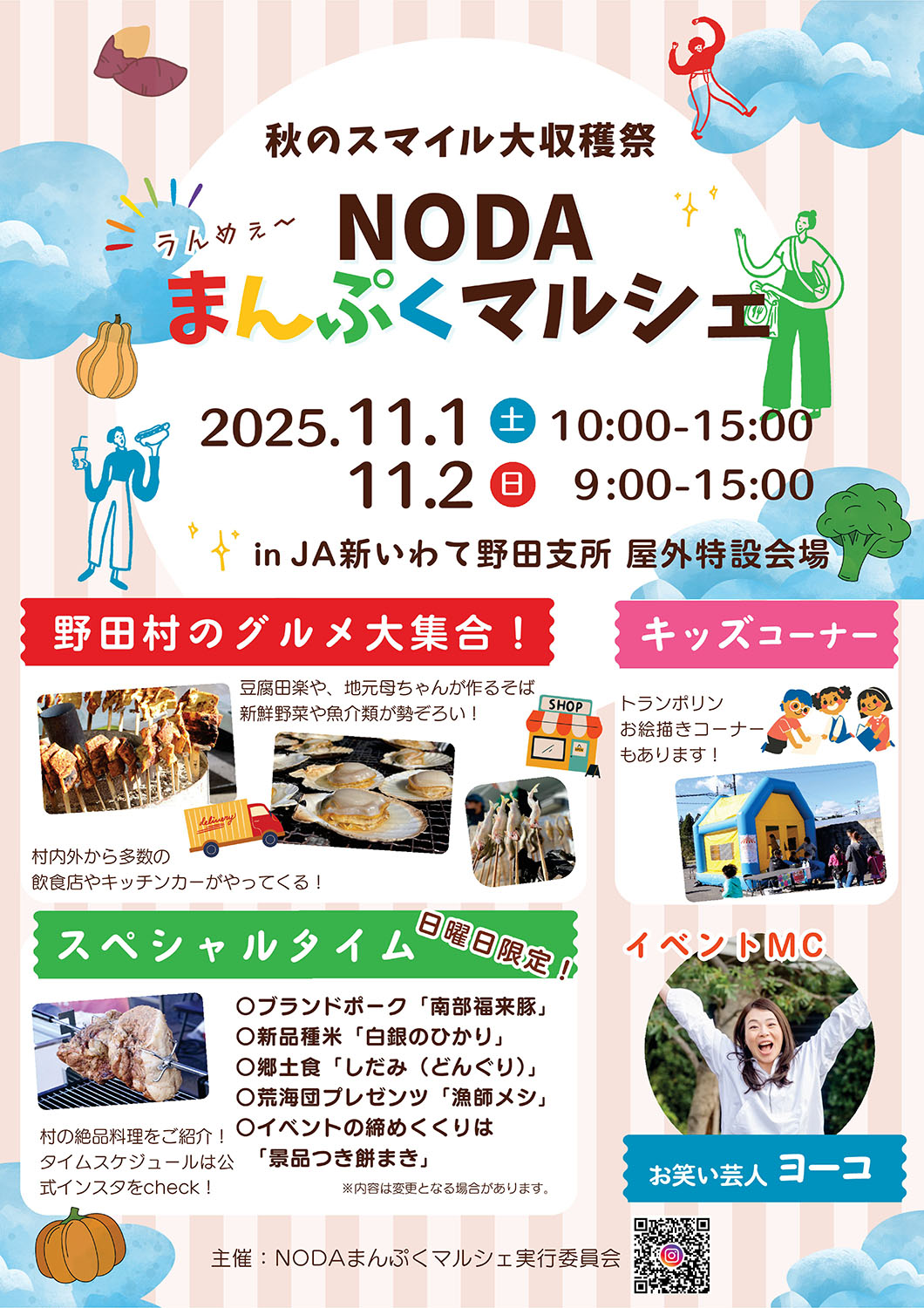 開催期間 日程 2025年11月1日(土)10:00~15:00 / 2025年11月2日(日)9:00~15:00 駐車場 野田村役場前 村民広場