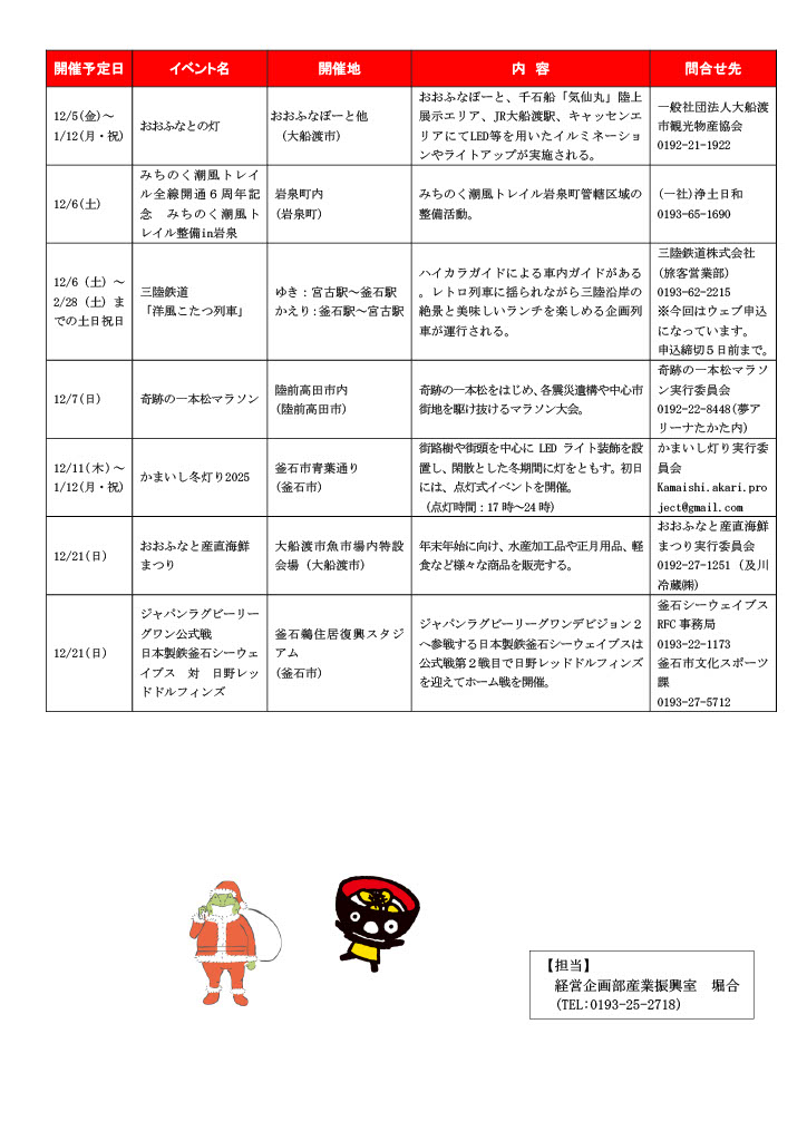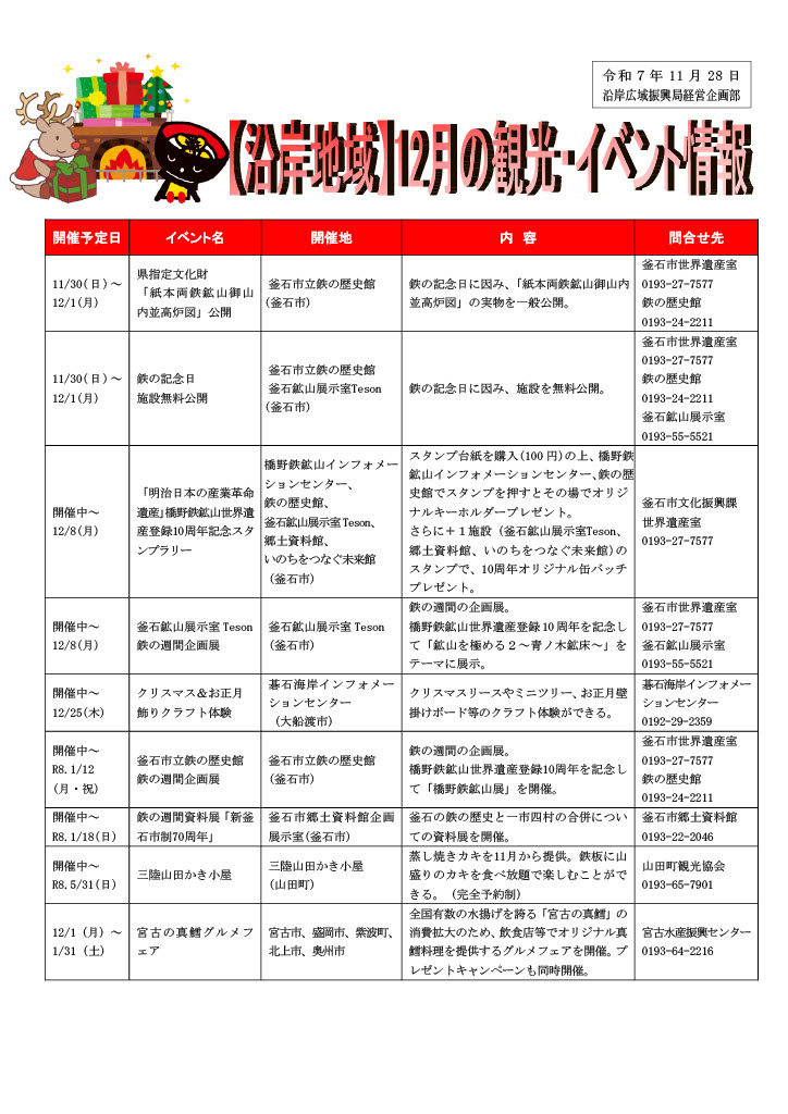 沿岸広域振興局が管内市町村等からとりまとめ、作成した、12月の観光・イベント情報を掲載します!