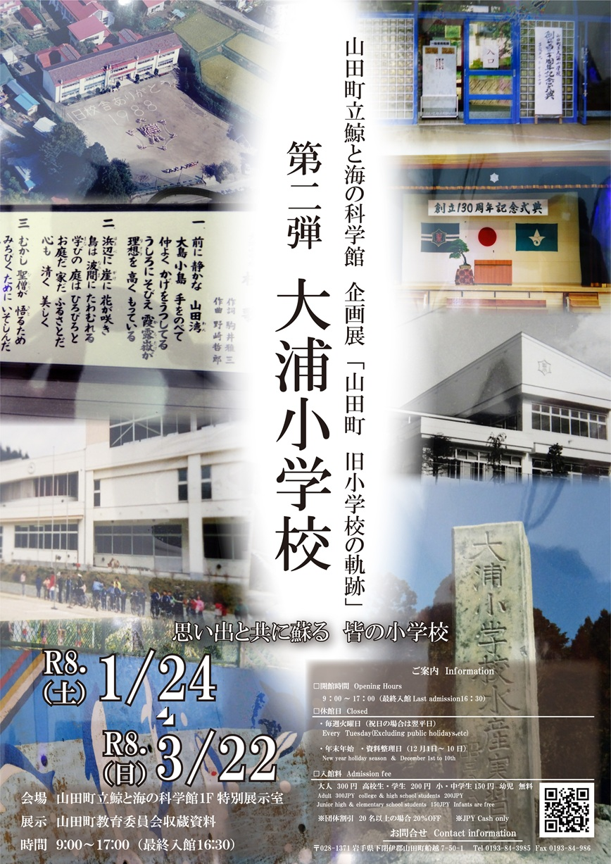 開催期間 近年、統廃合され閉校した山田町内の小学校の思い出を、山田町教育委員会に保管されている資料を展示し、振り返ります。 第一弾の荒川小学校に続き、第二弾は大浦小学校をご紹介します。 思い出とともに蘇る皆の小学校、みなさまぜひご覧ください。 企画展 「山田町 旧小学校の軌跡 第二弾 大浦小学校」 期 間:令和8年1月24日㈯~3月22日㈰ 時 間:9:00~17:00(最終入館16:30)