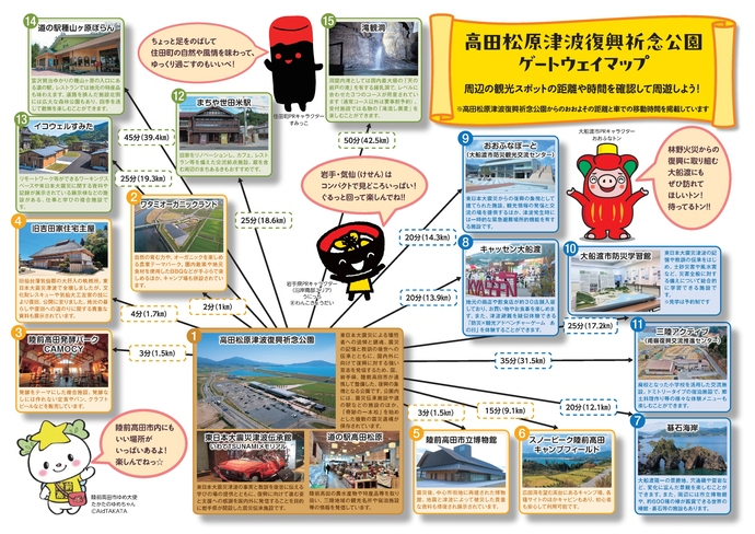 大船渡地域振興センターでは、陸前高田市の高田松原津波復興祈念公園を訪れる方々の観光周遊を促進するために、気仙管内の観光スポットやそこまでの移動時間等を紹介するチラシ「高田松原津波復興祈念公園ゲートウェイマップ」を作成いたしました。