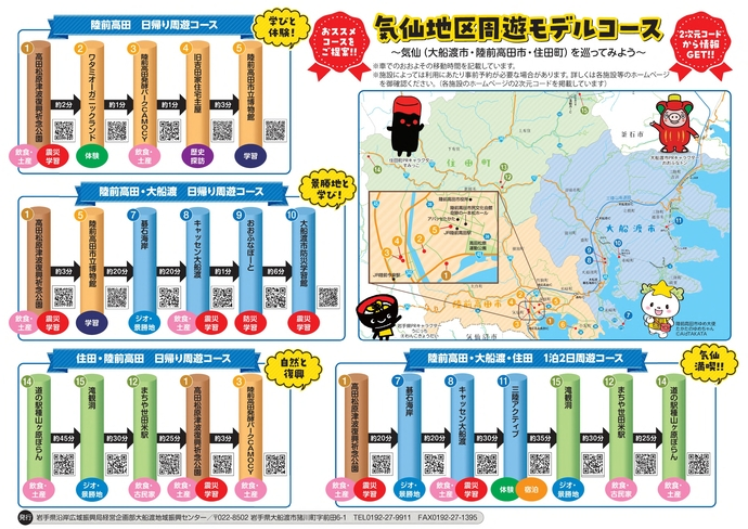 大船渡市、陸前高田市、住田町の主な観光地・観光施設の情報に加え、周遊の参考となるモデルコースもご紹介しています。また、チラシ裏面に掲載している2次元コードを読み込んでいただくと各施設等のHPをご覧いただけますので、気になる施設等がございましたら、ぜひチェックしてみてください。