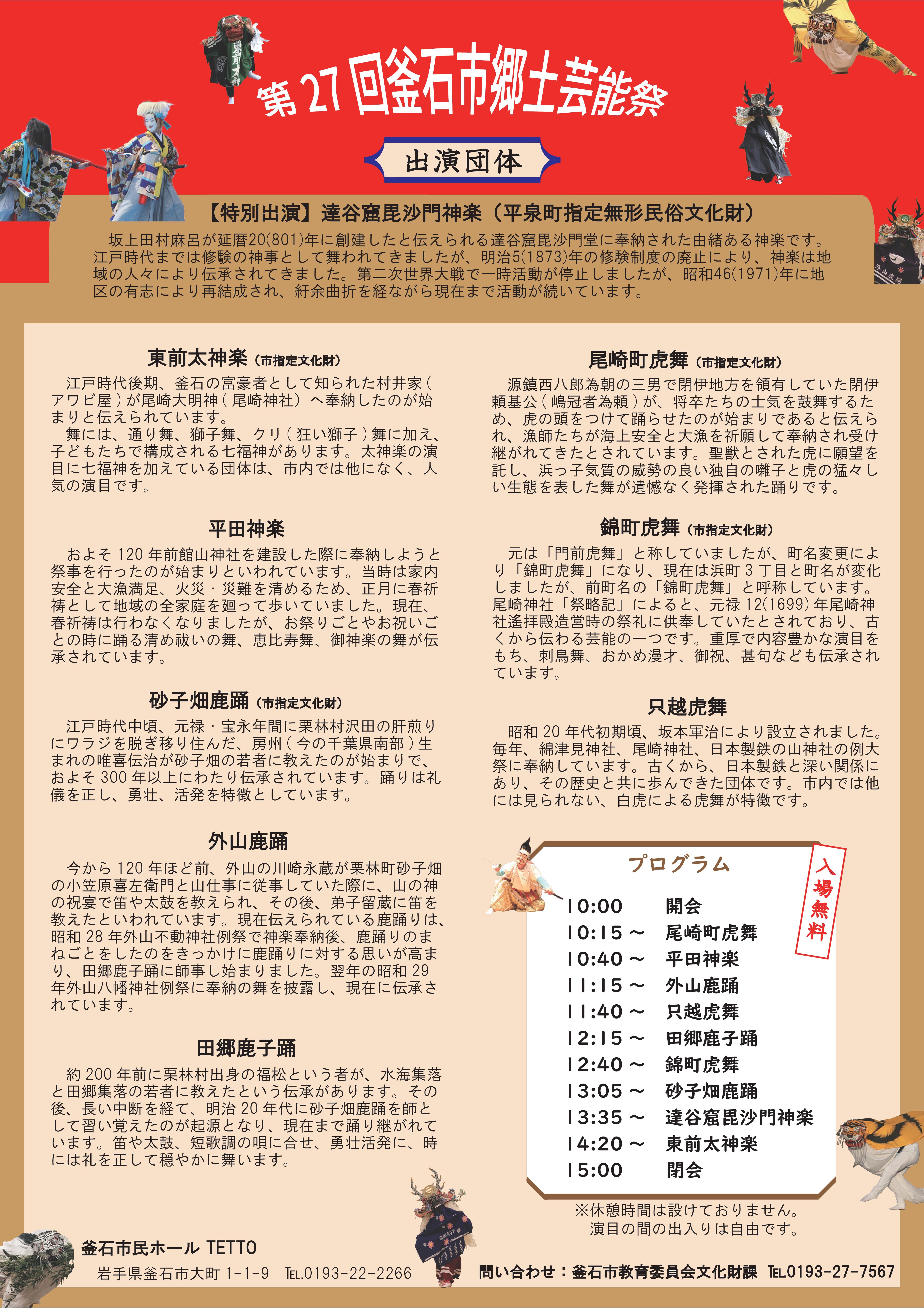 市内8団体の出演に加え、平成23年に世界遺産登録された平泉町から、平泉町指定無形民俗文化財の『達谷窟毘沙門神楽』をゲストに迎え開催となります。
