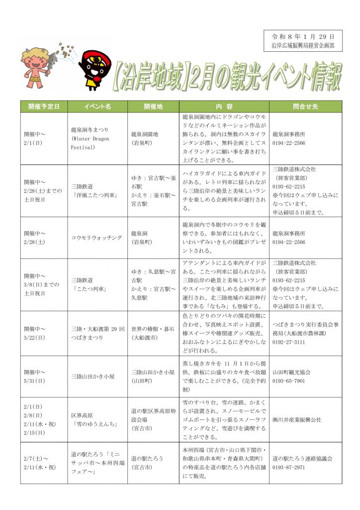 沿岸広域振興局が管内市町村等からとりまとめ、作成した、2月の観光・イベント情報を掲載します!