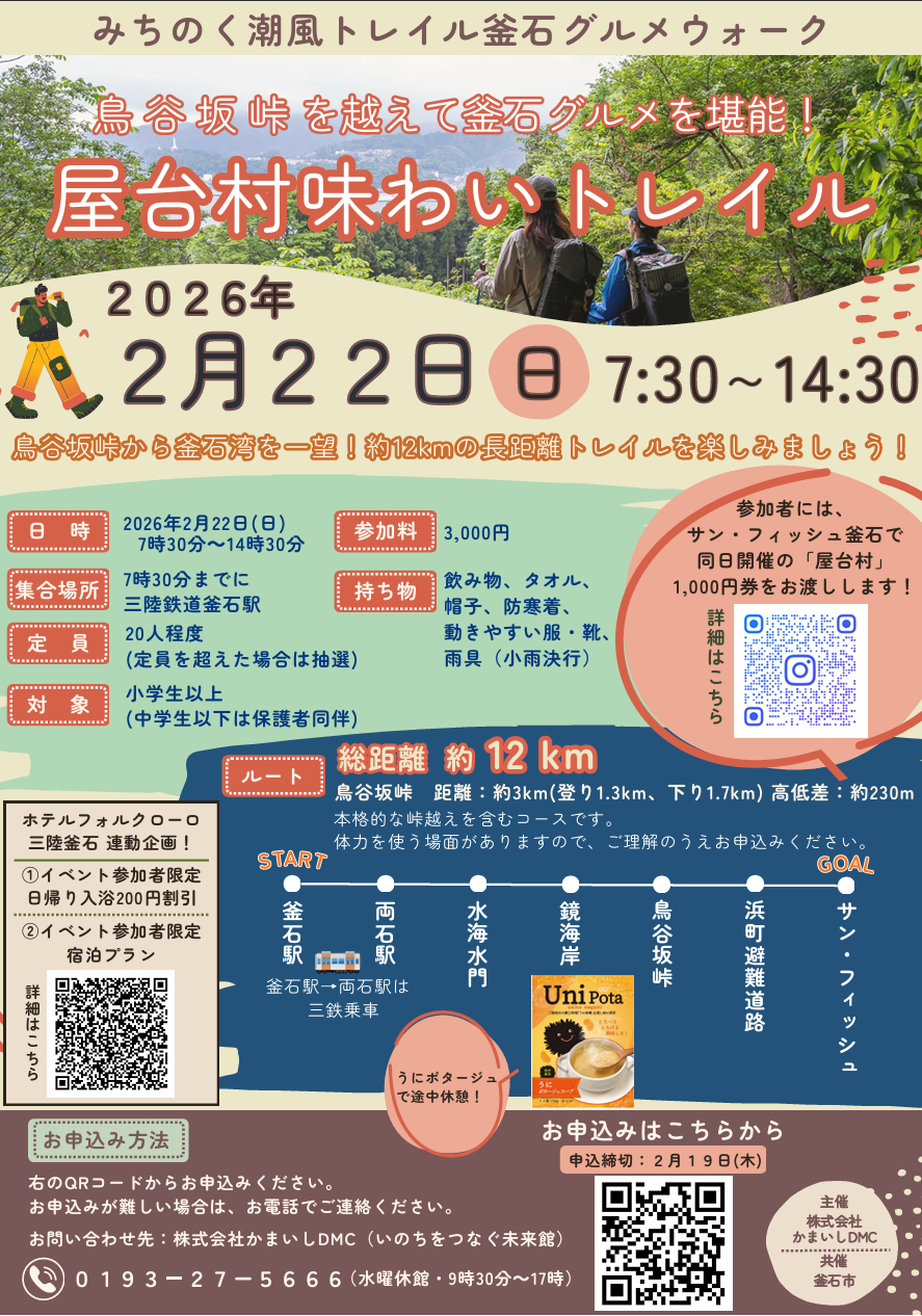 開催期間 イベント詳細 開催日時:2026年2月22日(日) 7:30~14:30 集合場所:三陸鉄道 釜石駅(7:30まで) 参加費:3,000円(屋台村で使える1,000円分チケット付き!) 定員:20人程度(小学生以上・抽選制) コース:釜石駅~両石駅(三鉄移動)~鳥谷坂峠~サン・フィッシュ釜石 申込締切:2月19日(木)まで 本格的な峠越え(高低差約230m)を含むため、体力を使うコースです 。途中の休憩では「うにポタージュ」の提供もあります!