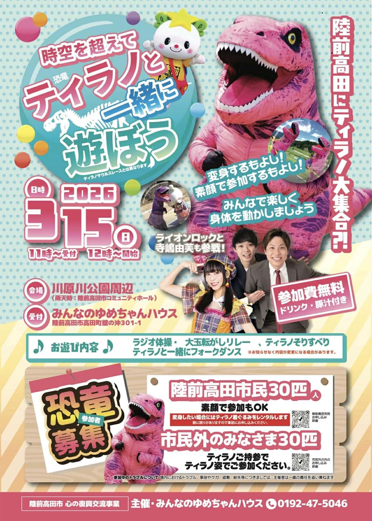 開催期間 ティラノと一緒に遊ぼう!(参加無料) 日時:2026/3/15(日) 11時〜受付 12時〜開始 会場:岩手県陸前高田市川原川公園 受付:みんなのゆめちゃんハウス 陸前高田市高田町字館の沖301-1 荒天時:陸前高田市コミュニティホール 陸前高田市高田町字栃ヶ沢210-3 当日の8時までに判断します。 内容:ラジオ体操、大玉転がしリレー、ティラノそりすべり、フォークダンスなどを予定