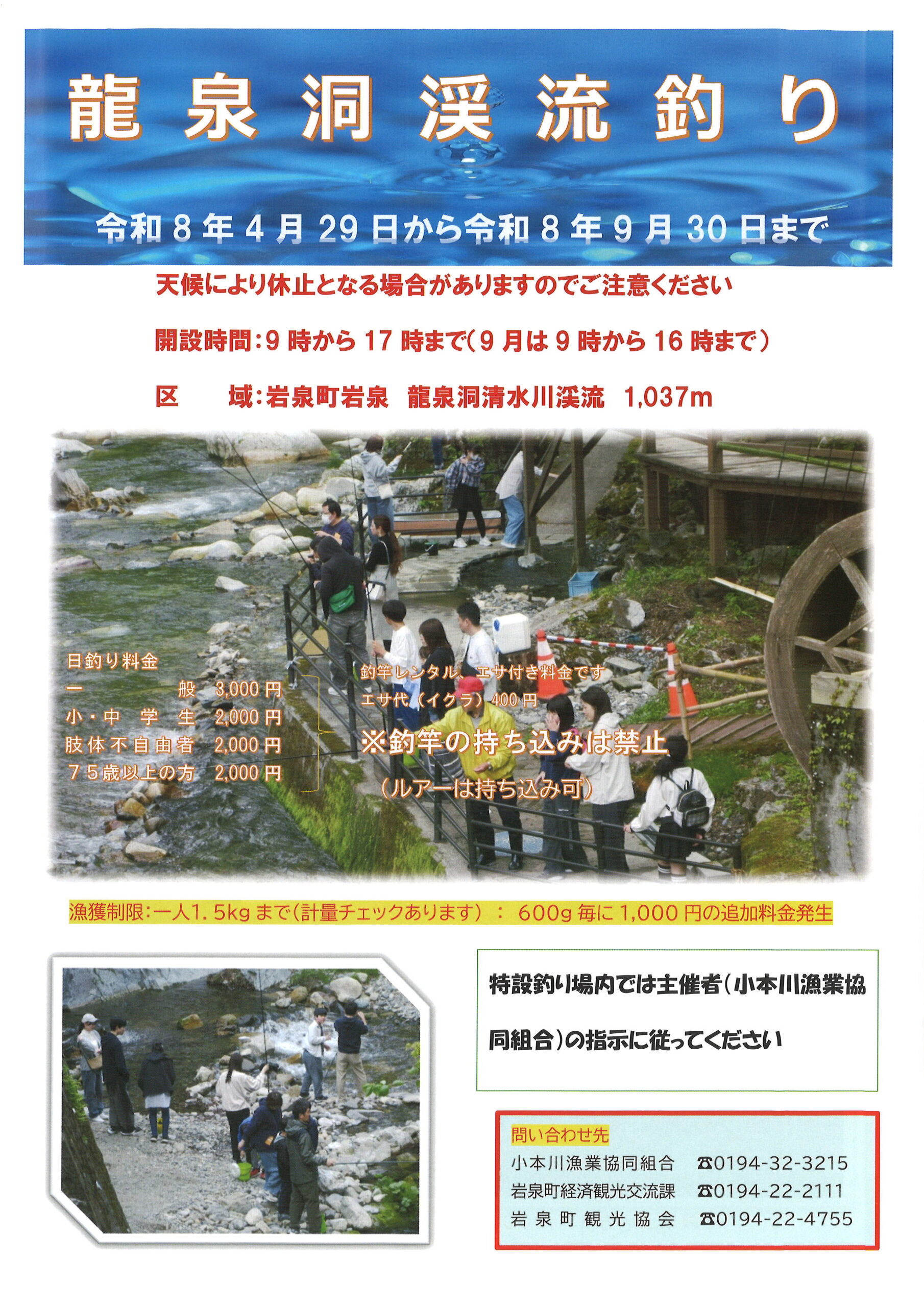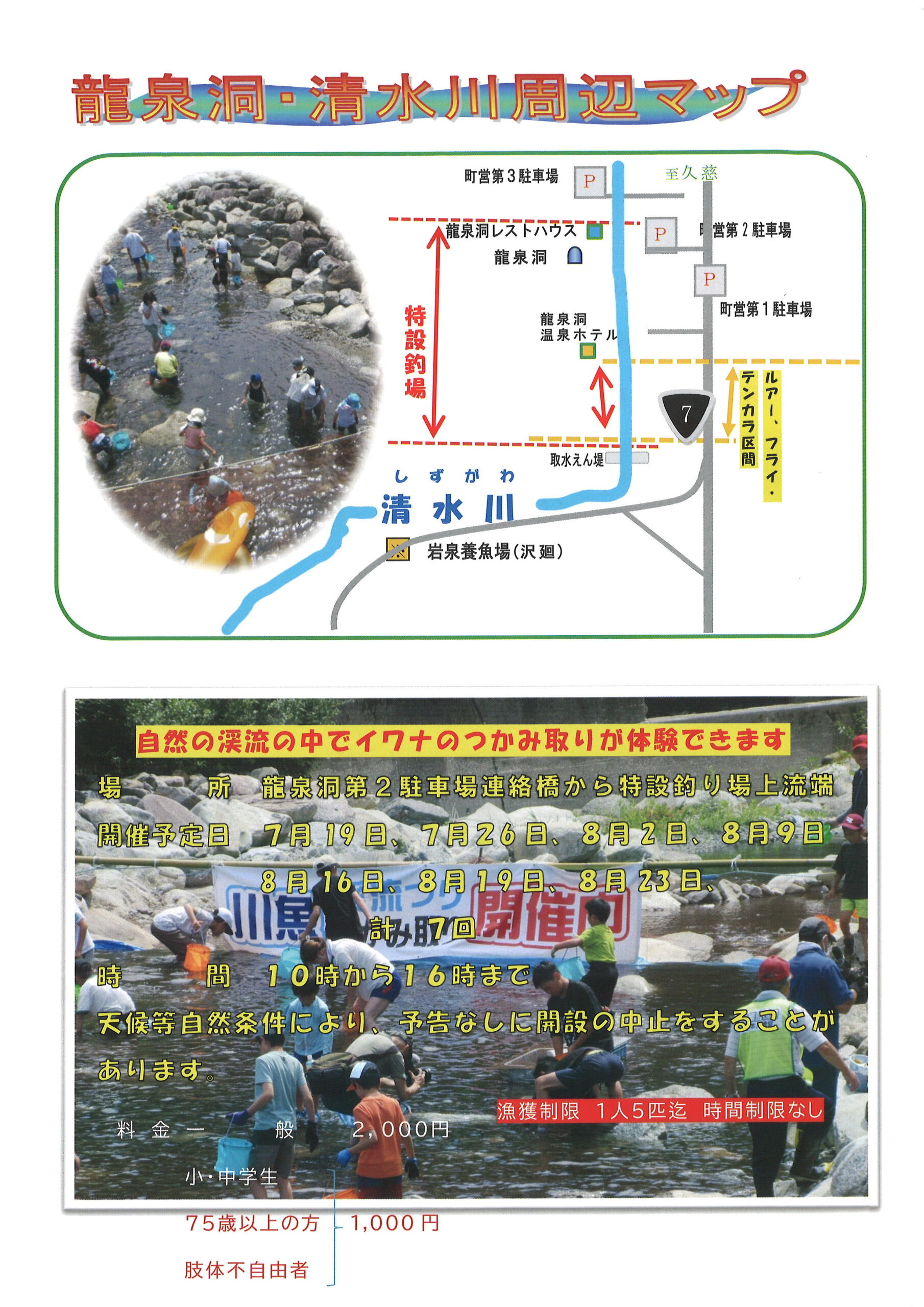 開催期間 今年の「龍泉洞渓流釣り」は4月29日(土)から開始します。 期間中は毎日開催予定ですが、天候により中止となる場合がありますので、お越しの前にお電話でご確認いただくことをおすすめいたします。 また、7月~8月に「イワナつかみ取り」を計7回予定しています。 開催日が変更・中止になる場合がありますのでご注意ください。 変更時には当サイトでお知らせいたします。 龍泉洞渓流釣り ◆開催期間 令和8年4月29日(水・祝)~9月30日(水) ◆開催時間 9:00~17:00(受付は16:00まで) ※9月のみ 9:00~16:00(受付は15:00まで) イワナつかみ取り ◆開催予定日 ※変更の可能性あり 7月19日(日)、26日(日) 8月2日(日)、9日(日)、16日(日)、19日(水)、23日(日) ◆開催時間 10:00~16:00