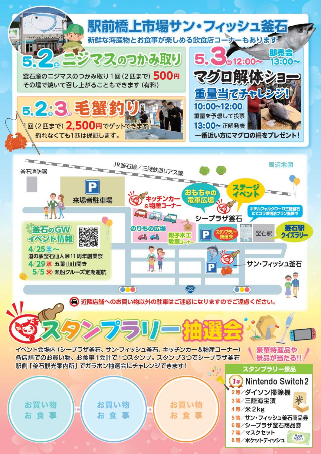 令和8年5月2日(土)、3日(日)に釜石駅周辺でかまいし春まつりを開催します。釜石のグルメを味わえる出店や親子で楽しめる催しがいっぱいです。